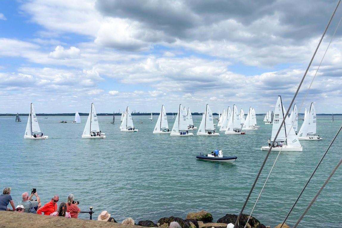 At the Squadron line, PRO Phil Warwick allowed extra time for the anticipated westerly to establish. The J/70s got away at their second attempt at 1340, followed by the SB20s, Sportsboat, Etchells, Daring, Dragon and Flying 15, with the breeze eventually proving a little fickle and shy to establish. The remaining fleets in White Group are now under AP to create a bit of a gap between the fleets and allow the breeze to fill back in.